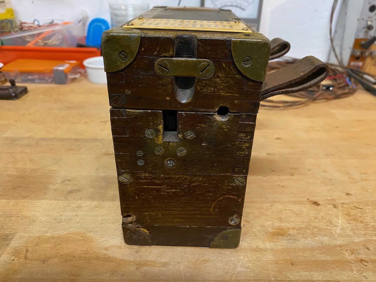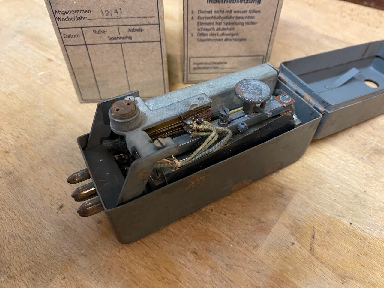 For the "kleiner Feldfernsprecher 17" there existed also a "Umgeänderter Zusatzkasten" or a "Weckerzusatz 17" to make it magneto call compatible [5][6]. The included "Vermittlungsschnur" (Switching cord) was carried in a pouch on the carrying strap (both missing on mine) [4].