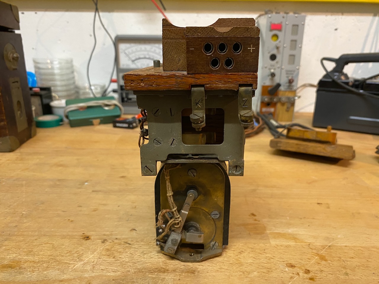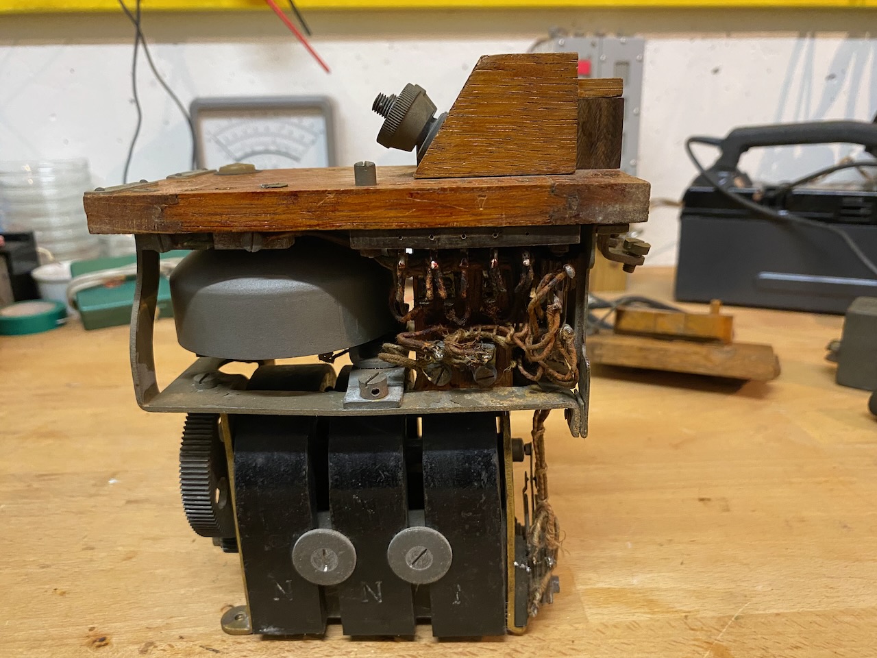 On the bottom the 3 bar magneto, above the ringer and to it's left the two connections sockets.
