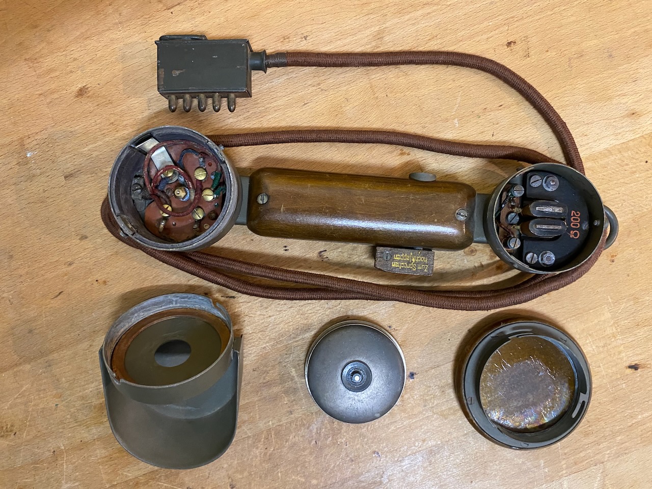 - The "Feldhandapparat 17" (Field Handset) consists of a wooden handle with an oval cross-section, which houses the springs for the push-to-talk button and the earpiece. The receiver and microphone are mounted similarly to the "Feldhandapparat 26", except that the microphone opening here consists of a hinged metal plate. The push-to-talk button — which, due to operating errors and user fatigue, was replaced by a hook switch on the "Feldfernsprecher 26" — is rotatable by 90 degrees so that when the handset is gripped correctly, the corresponding circuits inside are activated. The talk button must also be pressed to listen. For better hearing, the loudspeaker button must be pressed, which bridges the talk button and the secondary winding. The connecting cord to the handset has five conductors and terminates in a five-prong plug.