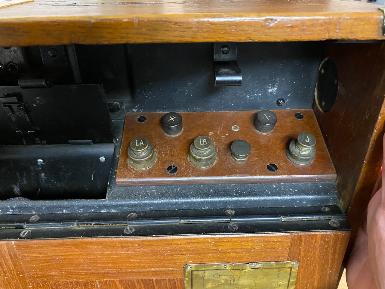 This specimen is a later “B” version, produced after 1934. It was seized by the Germans during the occupation of Norway, as indicated by the German spelling table attached to it. Most of the “B model” devices found on DigitaltMuseum also appear with German spelling tables and sometimes German user guides attached.