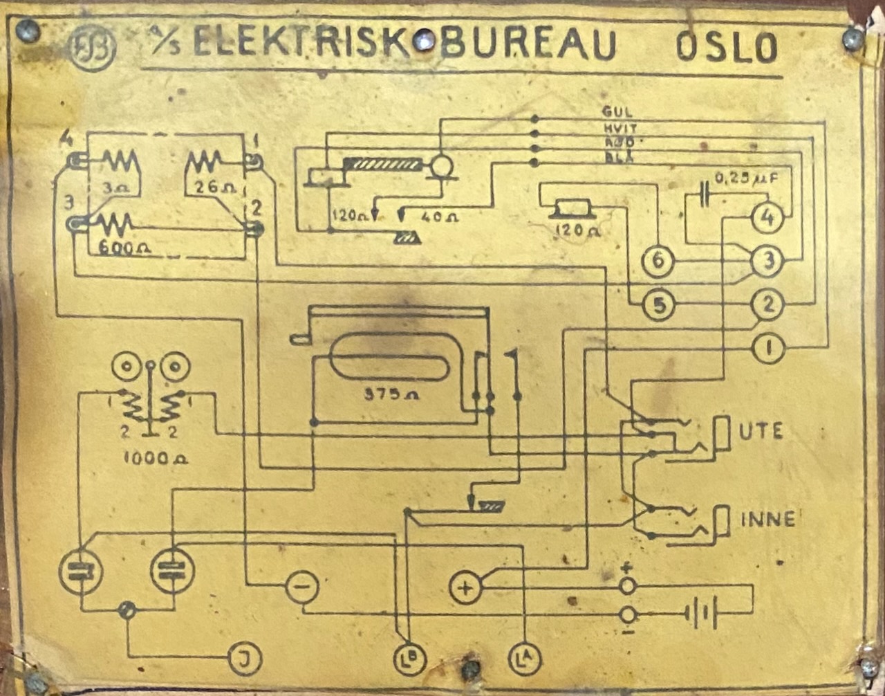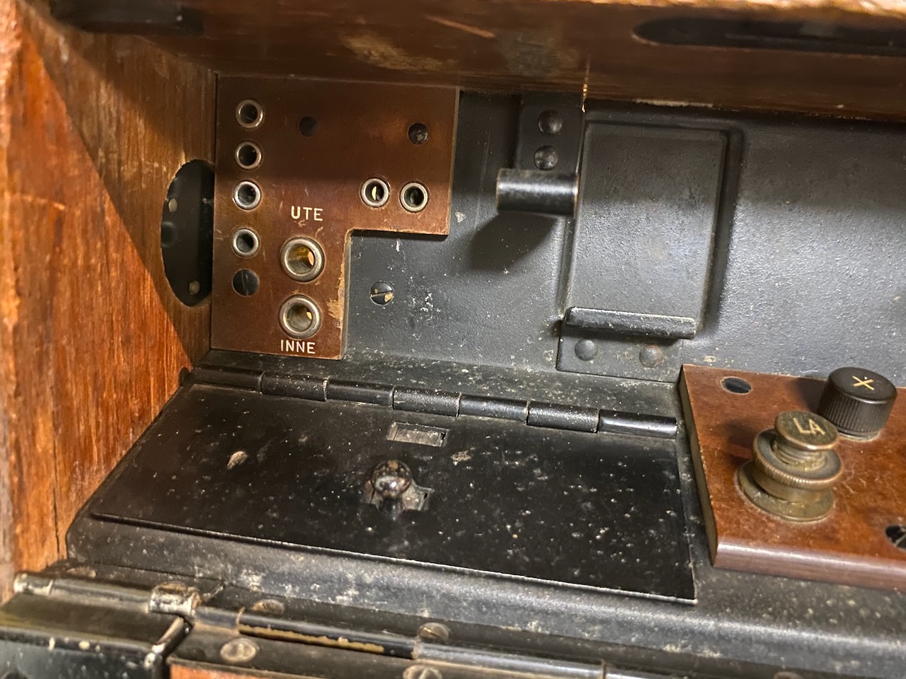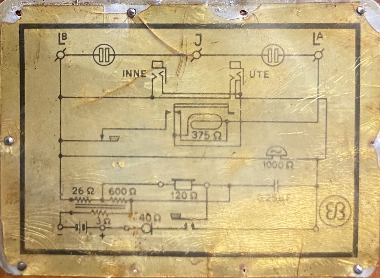 This Elektrisk Buerau made device was commissioned by the Norwegian Army in 1930, acquired in 1931, and remained in use up to and during WWII. Elektrisk Bureau had already developed and sold a very similar device to the Turkish Army in 1929, and that earlier model served as the basis for the Norwegian version. In 1932, a dial unit and an amplifier attachment were added. In 1934, minor updates were made to the electrical system: the simple primary/secondary coil was replaced with an anti-sidetone coil setup. The earlier units were then designated as the “A model", while the updated versions became the “B model". An oval plate was mounted on top of the sets, marked with either A or B accordingly [1][2][5][6][11][12].