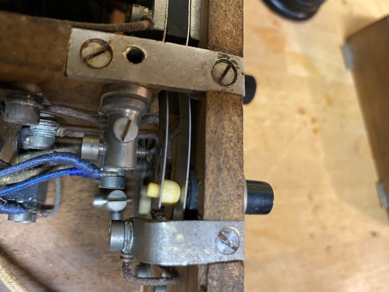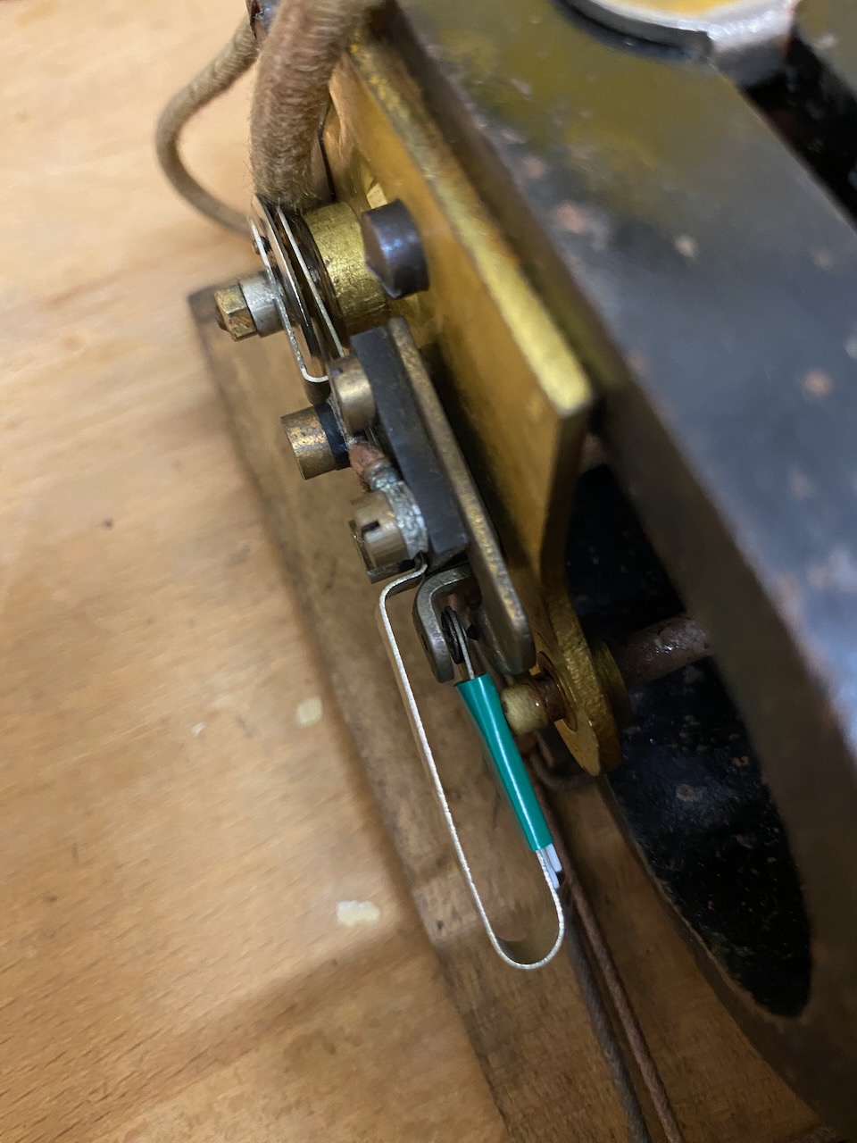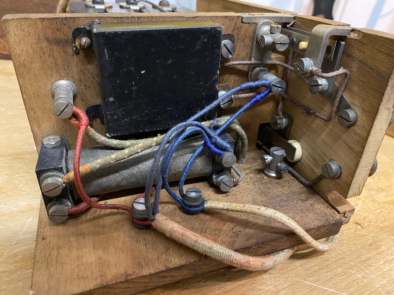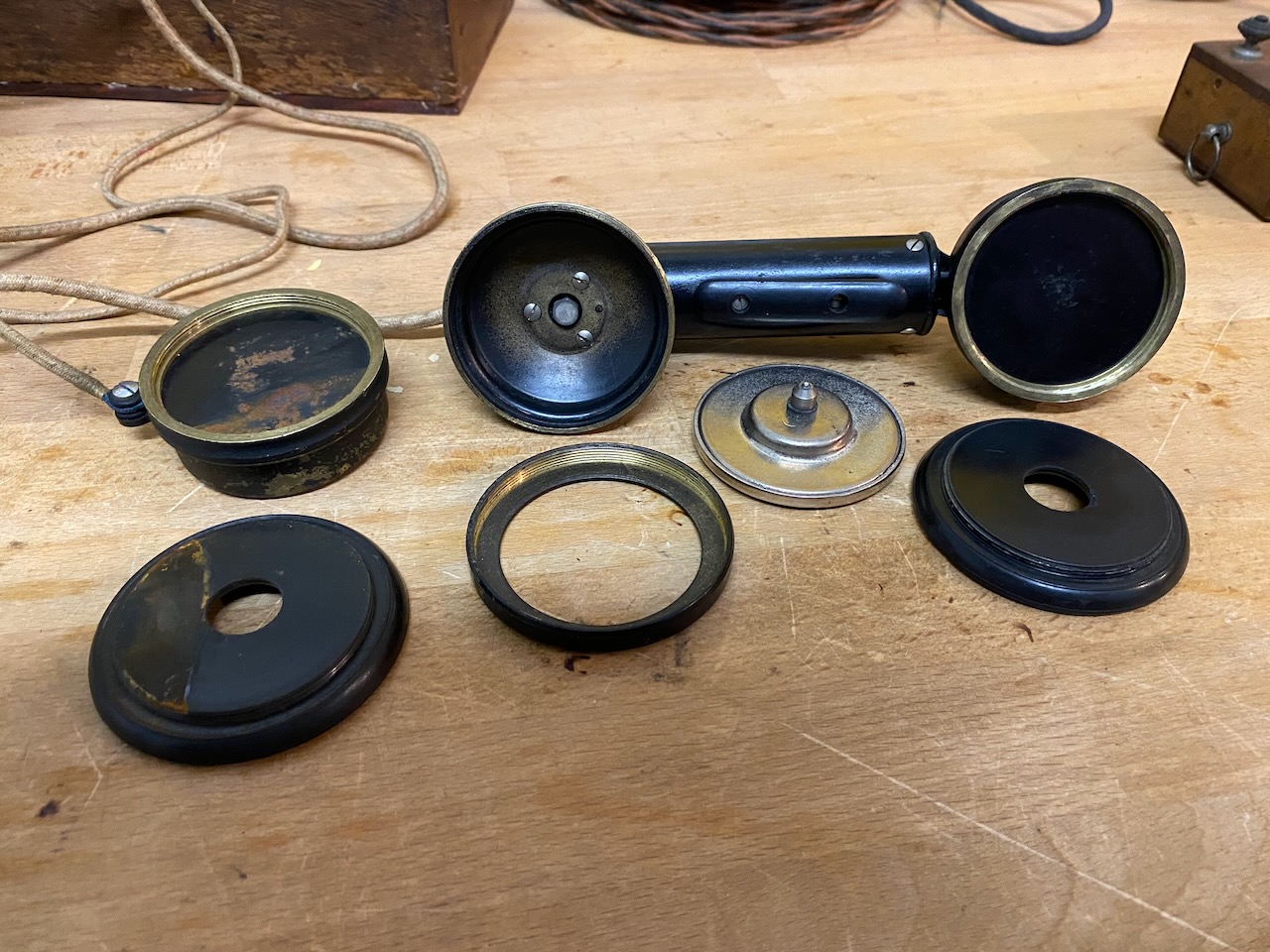 The magneto on this set can be used as normal magneto to generate a low frequency signal to activate polarized or vibrating ringers. An added buzzer circuit with a buzzer blade can be activated (using the black button) to generate a higher frequency signal which can be heard on far end receivers. This type of buzzer does not require battery power as other typical field phone buzzers of that era.