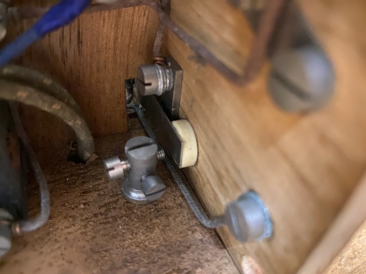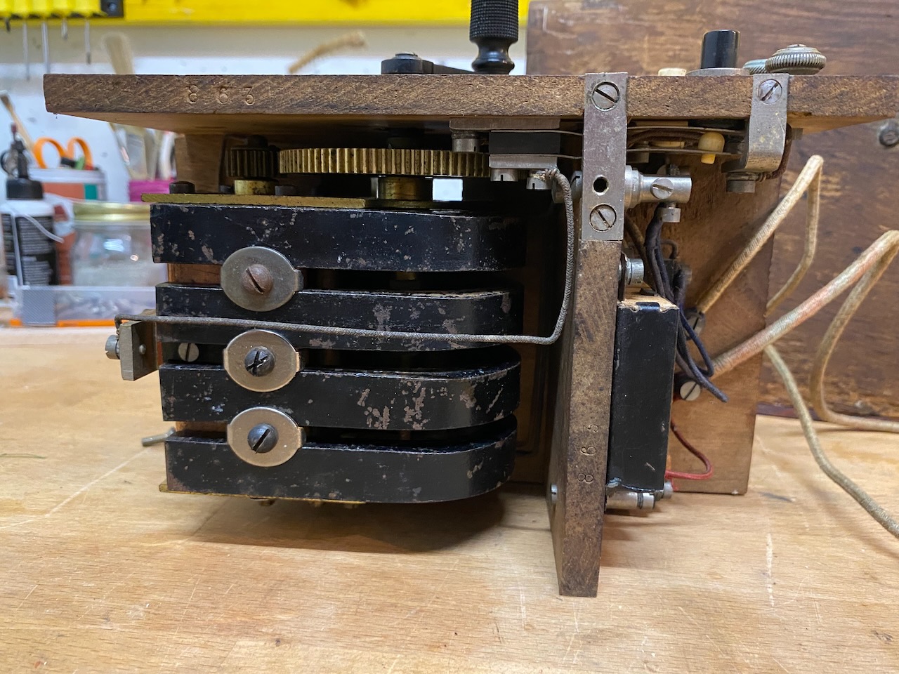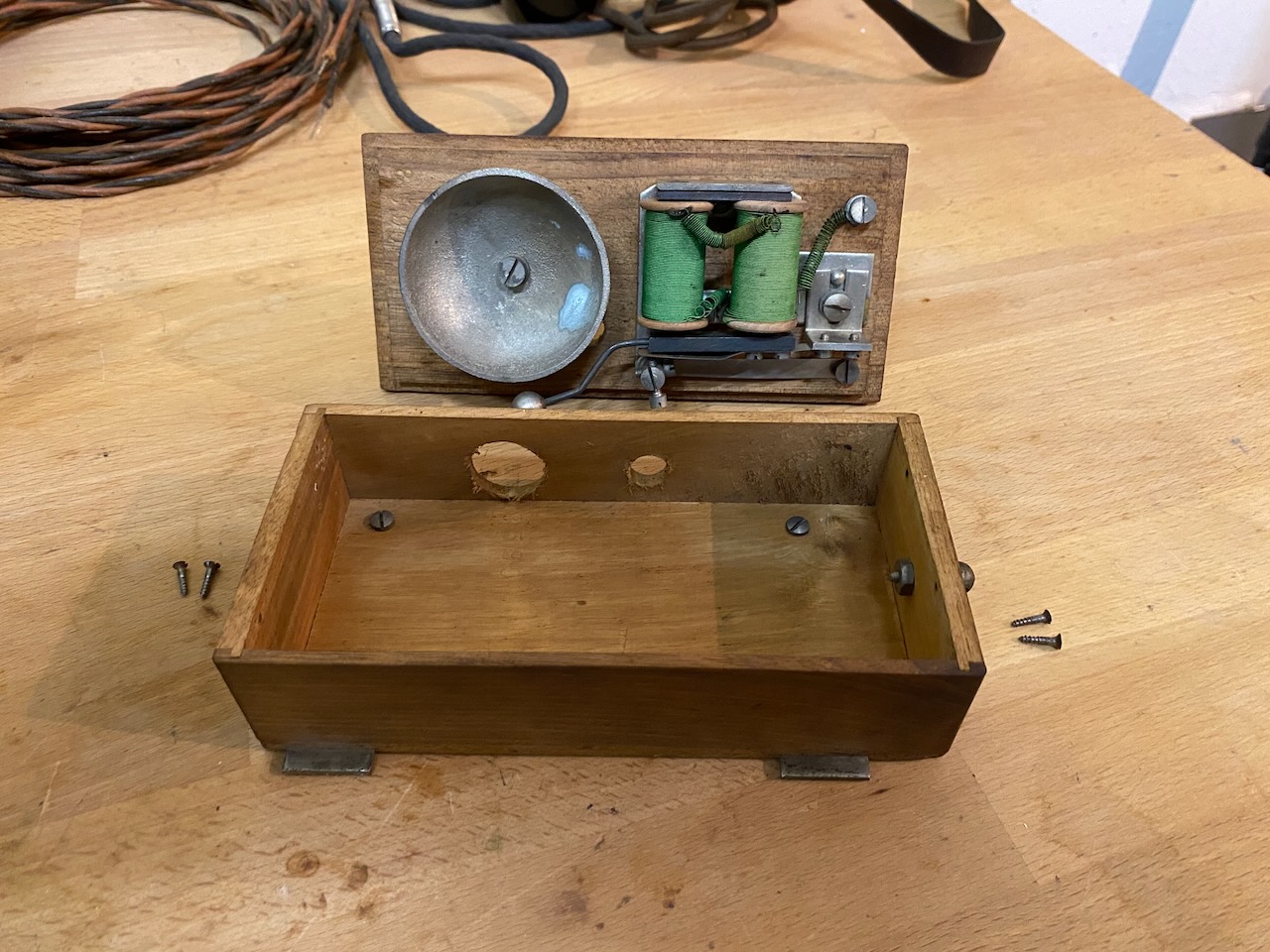 The magneto on this set can be used as normal magneto to generate a low frequency signal to activate polarized or vibrating ringers. An added buzzer circuit with a buzzer blade can be activated (using the black button) to generate a higher frequency signal which can be heard on far end receivers. This type of buzzer does not require battery power as other typical field phone buzzers of that era.