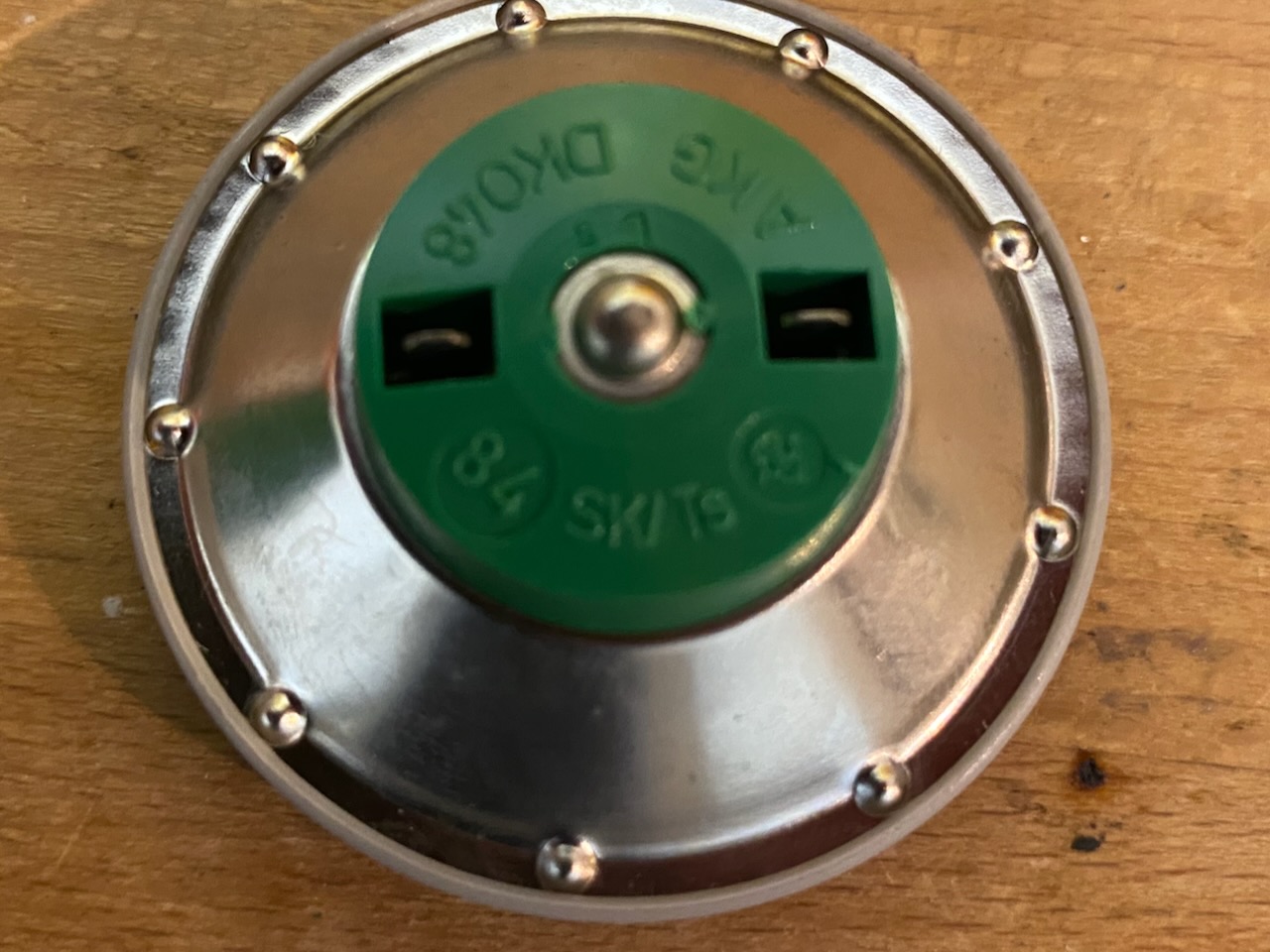 Line binding post at the bottom, can take banana plugs or wires, here a cord with a swiss railway line plug is connected.