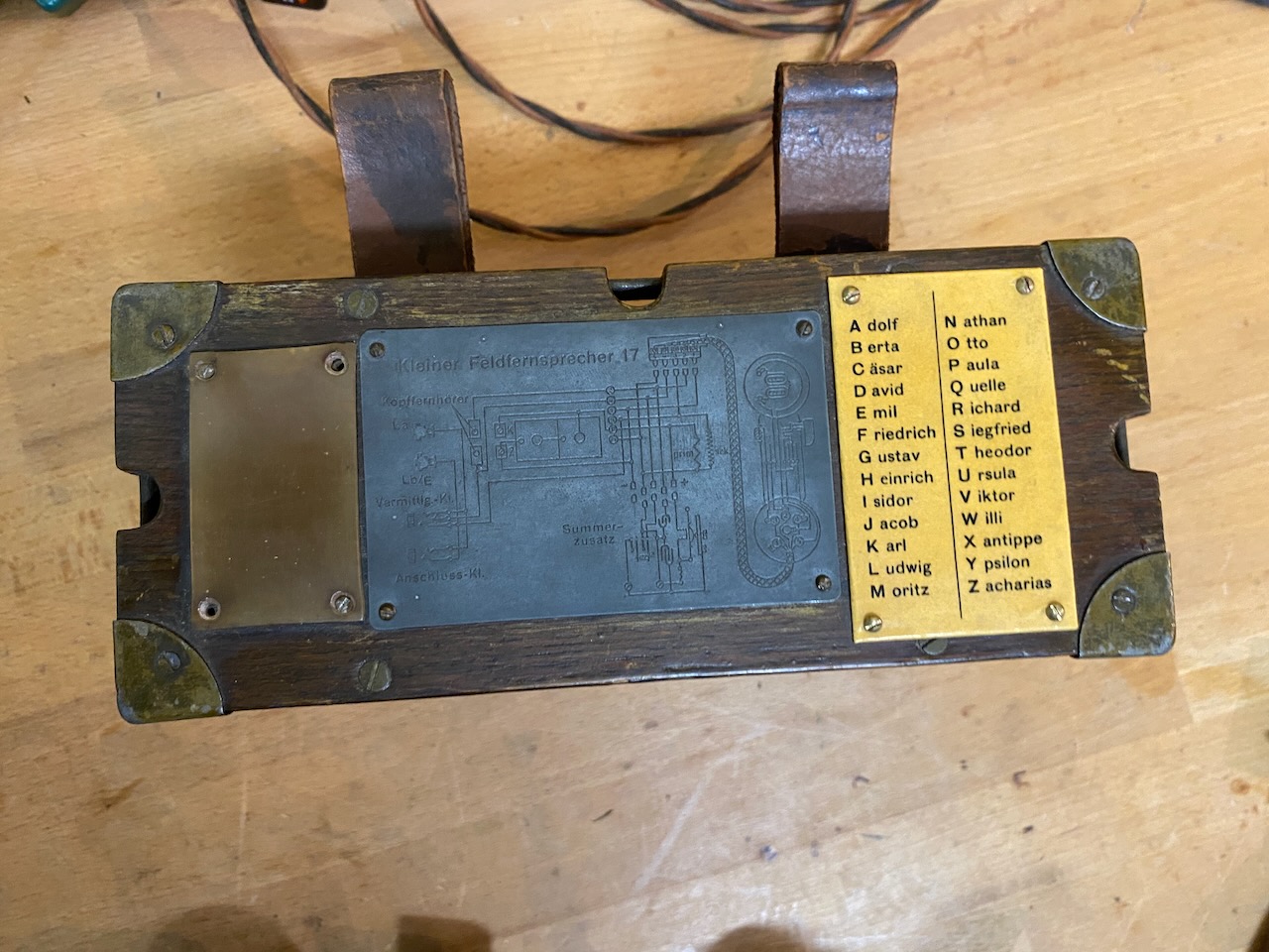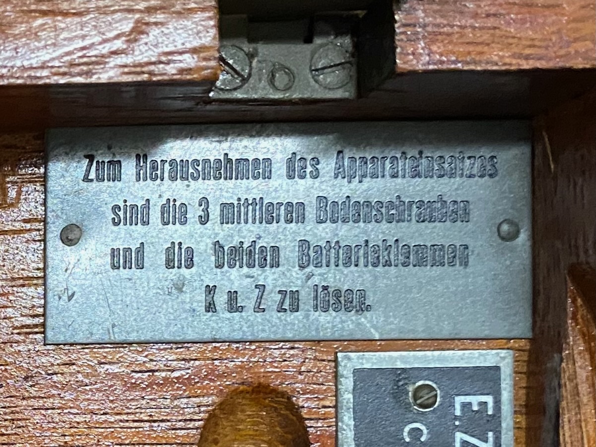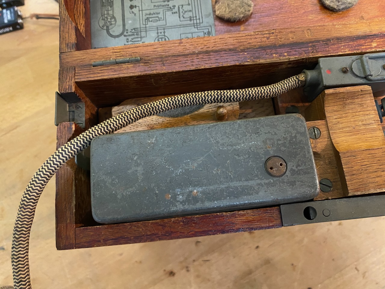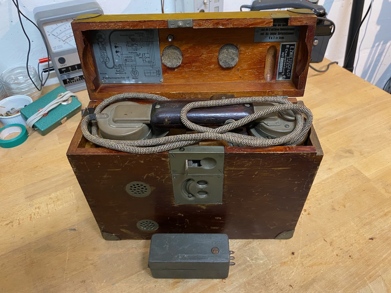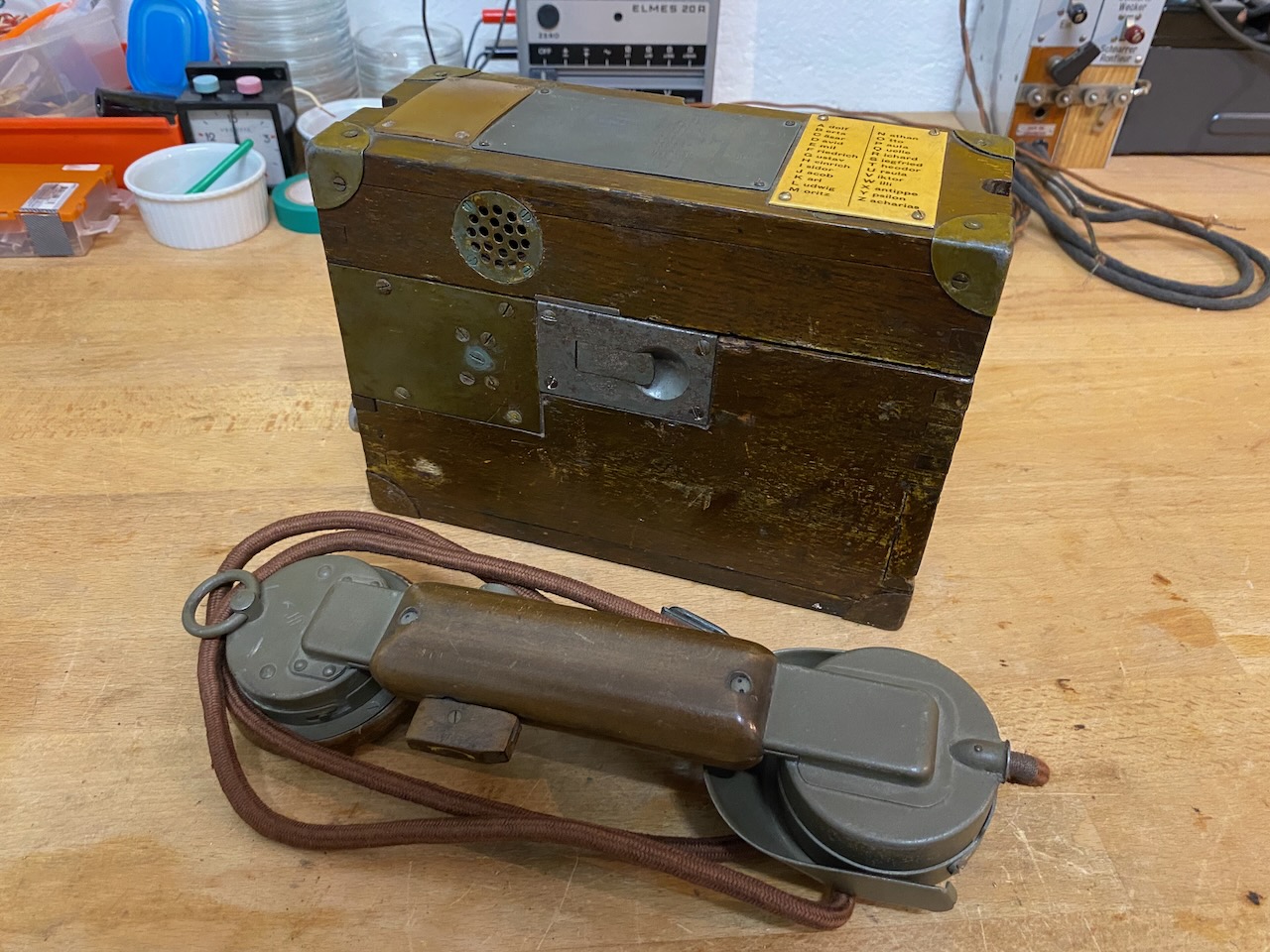 For the "kleiner Feldfernsprecher 17" there existed also a "Umgeänderter Zusatzkasten" or a "Weckerzusatz 17" to make it magneto call compatible [5][6]. The included "Vermittlungsschnur" (Switching cord) was carried in a pouch on the carrying strap (both missing on mine) [4].