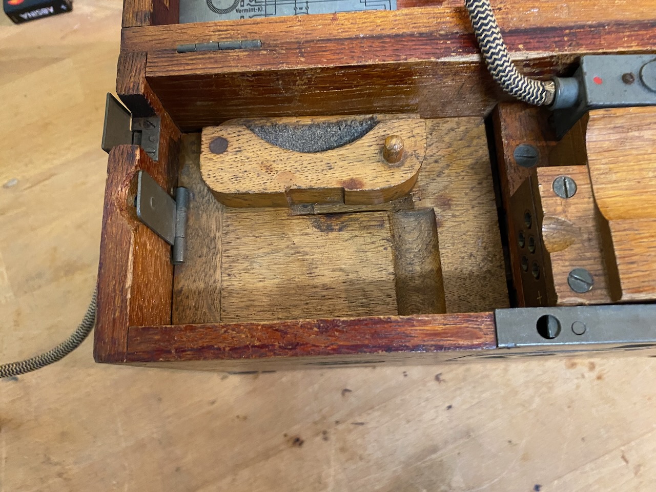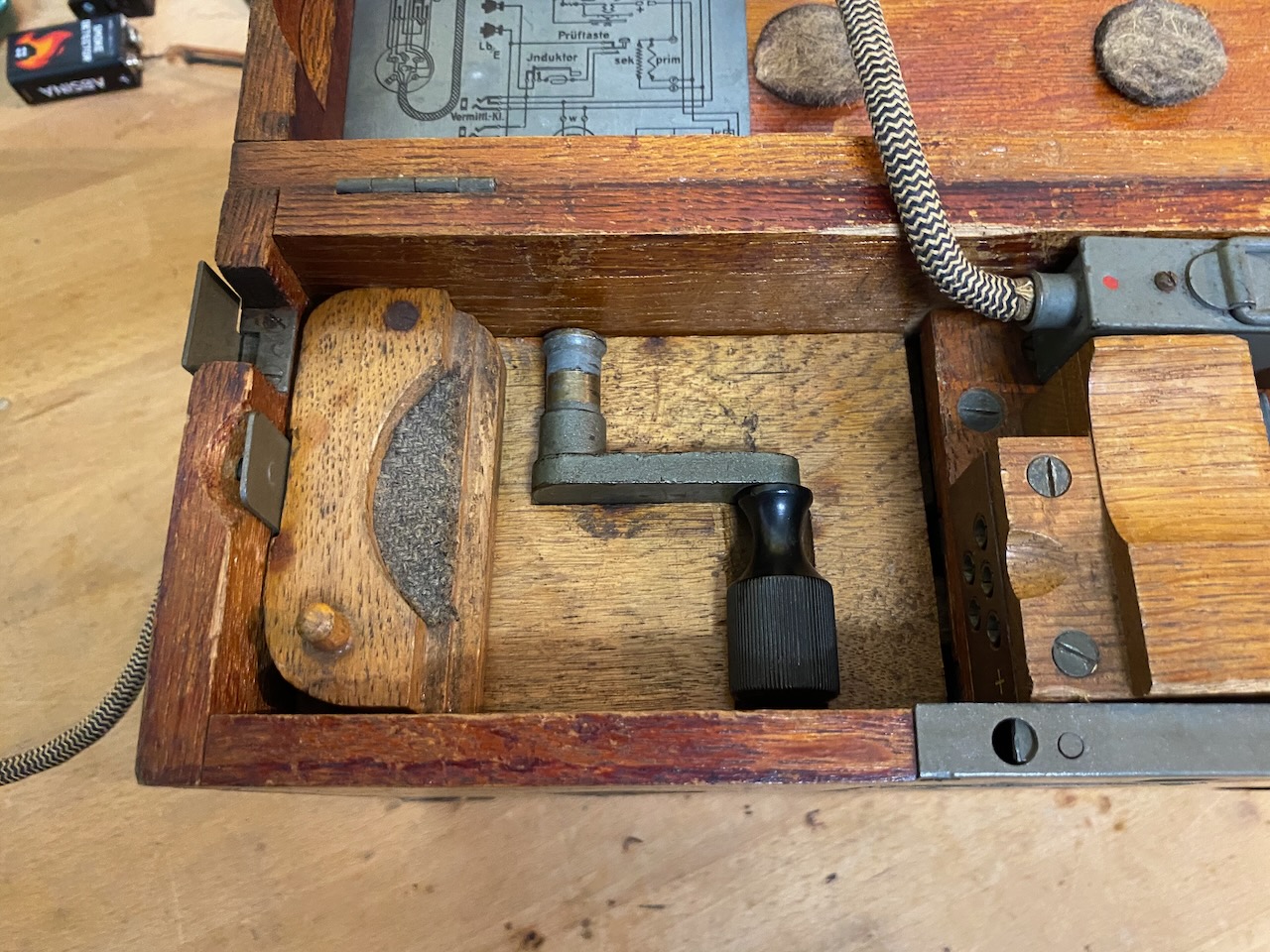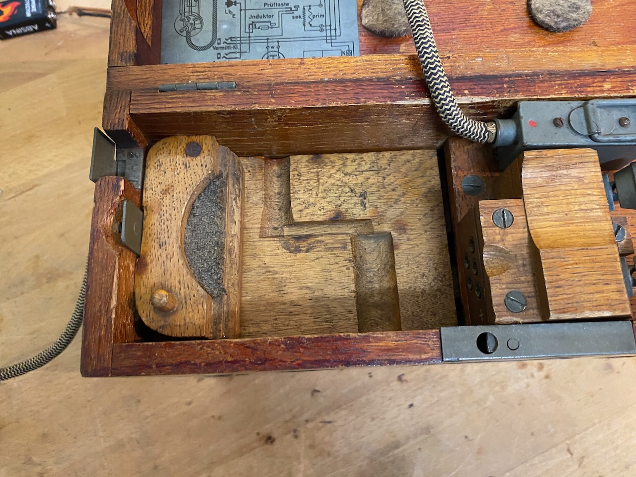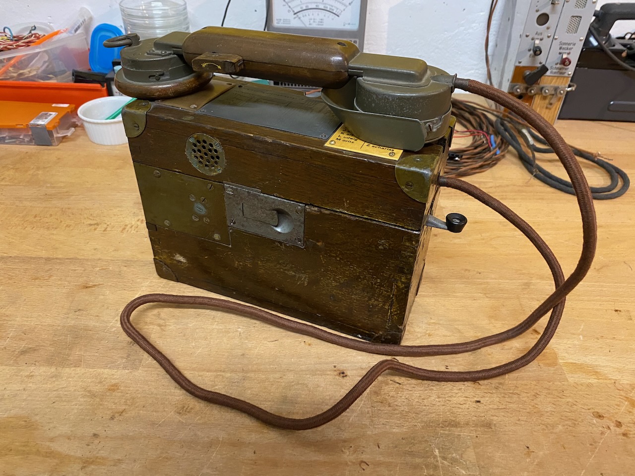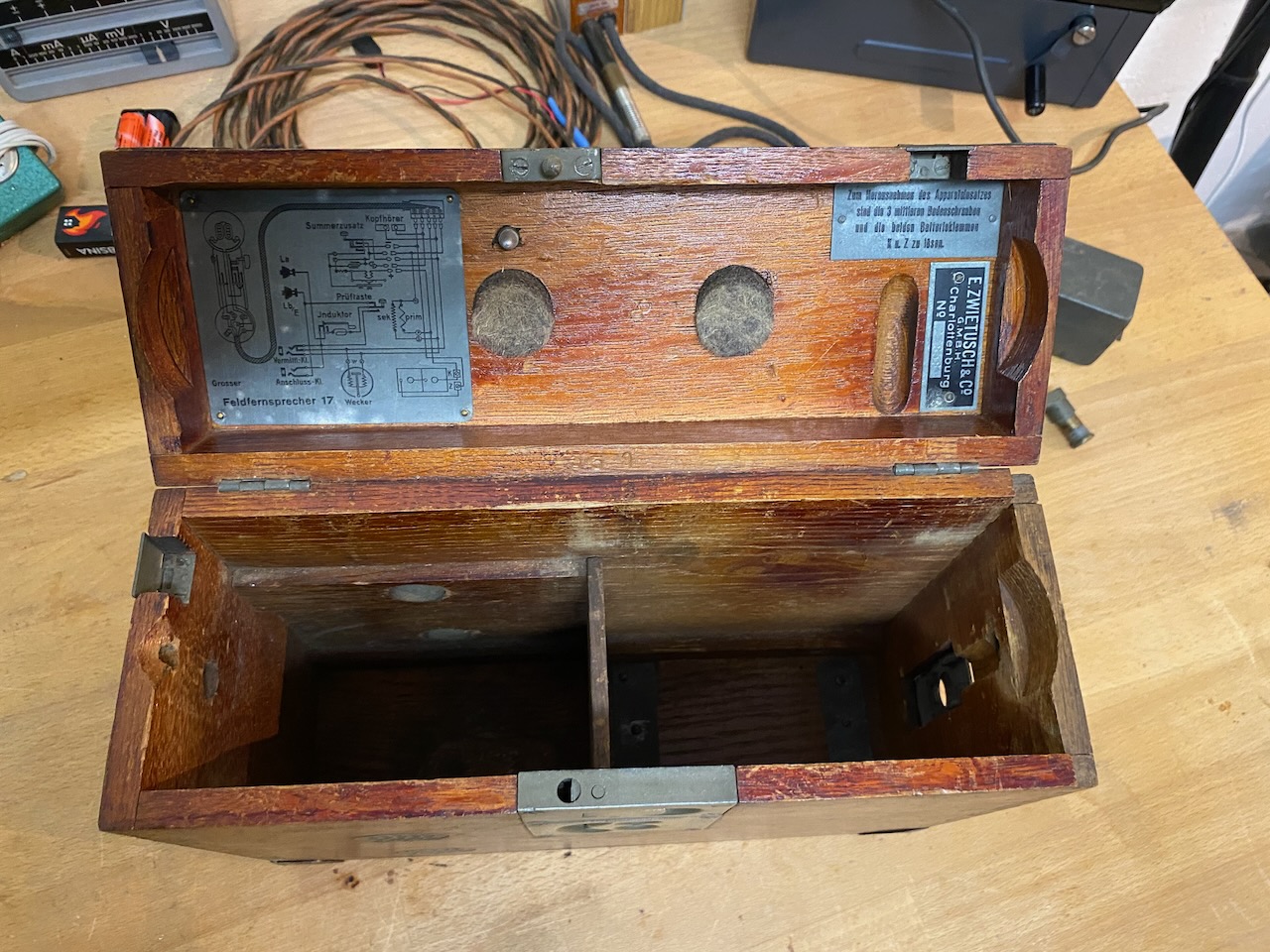 For the "kleiner Feldfernsprecher 17" there existed also a "Umgeänderter Zusatzkasten" or a "Weckerzusatz 17" to make it magneto call compatible [5][6]. The included "Vermittlungsschnur" (Switching cord) was carried in a pouch on the carrying strap (both missing on mine) [4].