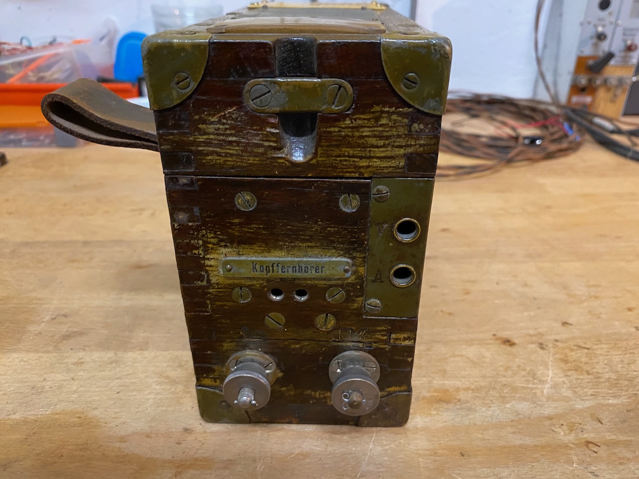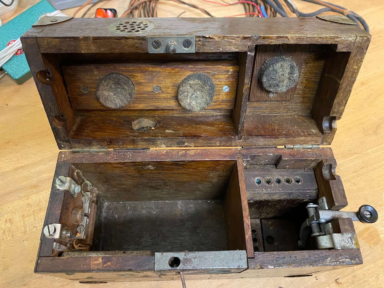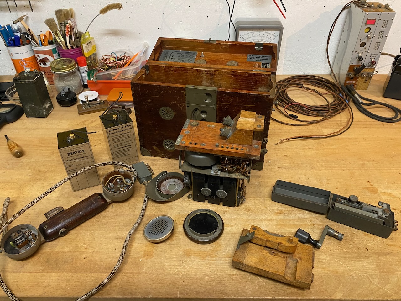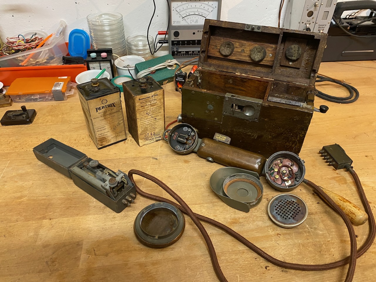For the "kleiner Feldfernsprecher 17" there existed also a "Umgeänderter Zusatzkasten" or a "Weckerzusatz 17" to make it magneto call compatible [5][6]. The included "Vermittlungsschnur" (Switching cord) was carried in a pouch on the carrying strap (both missing on mine) [4].