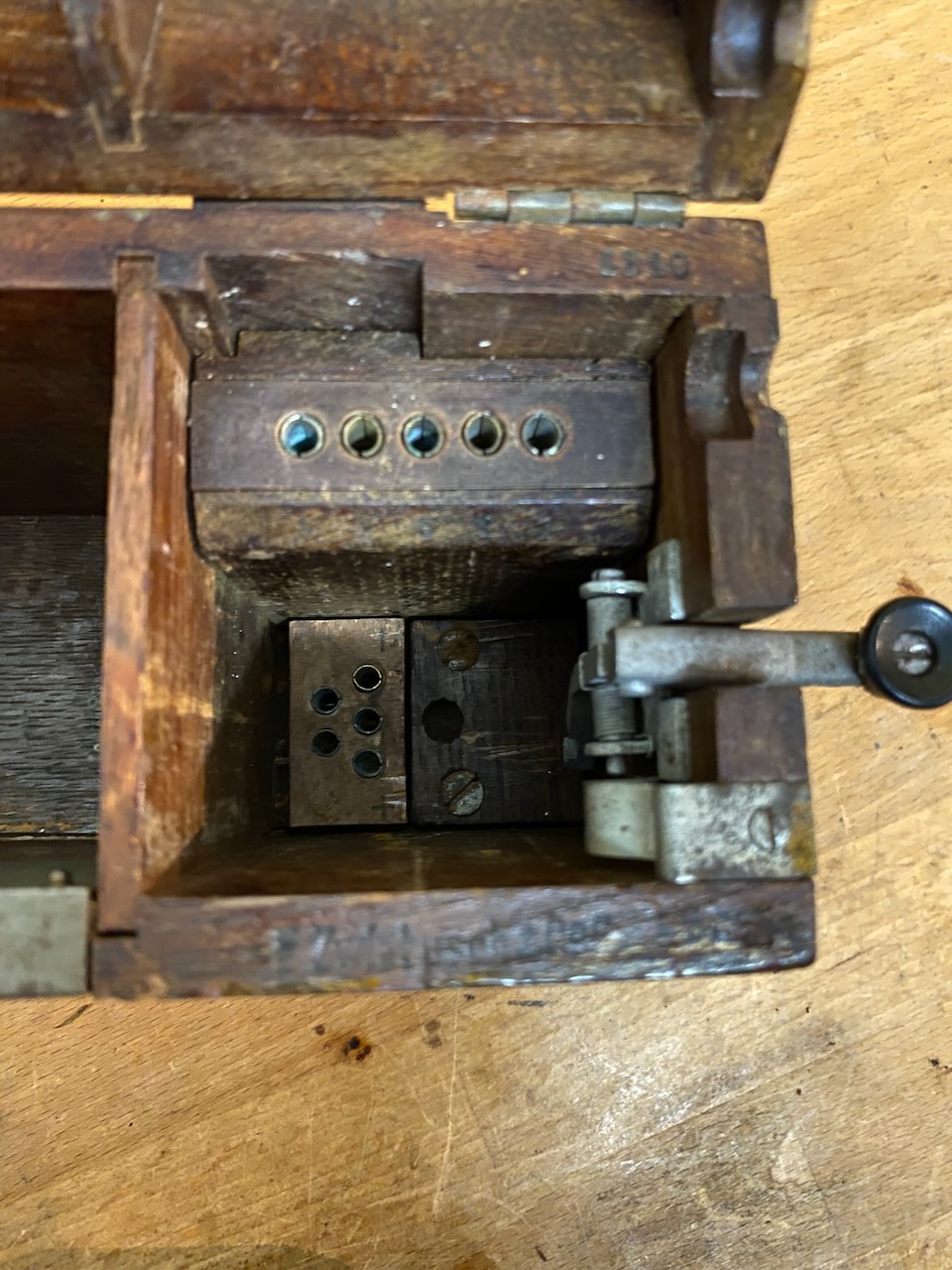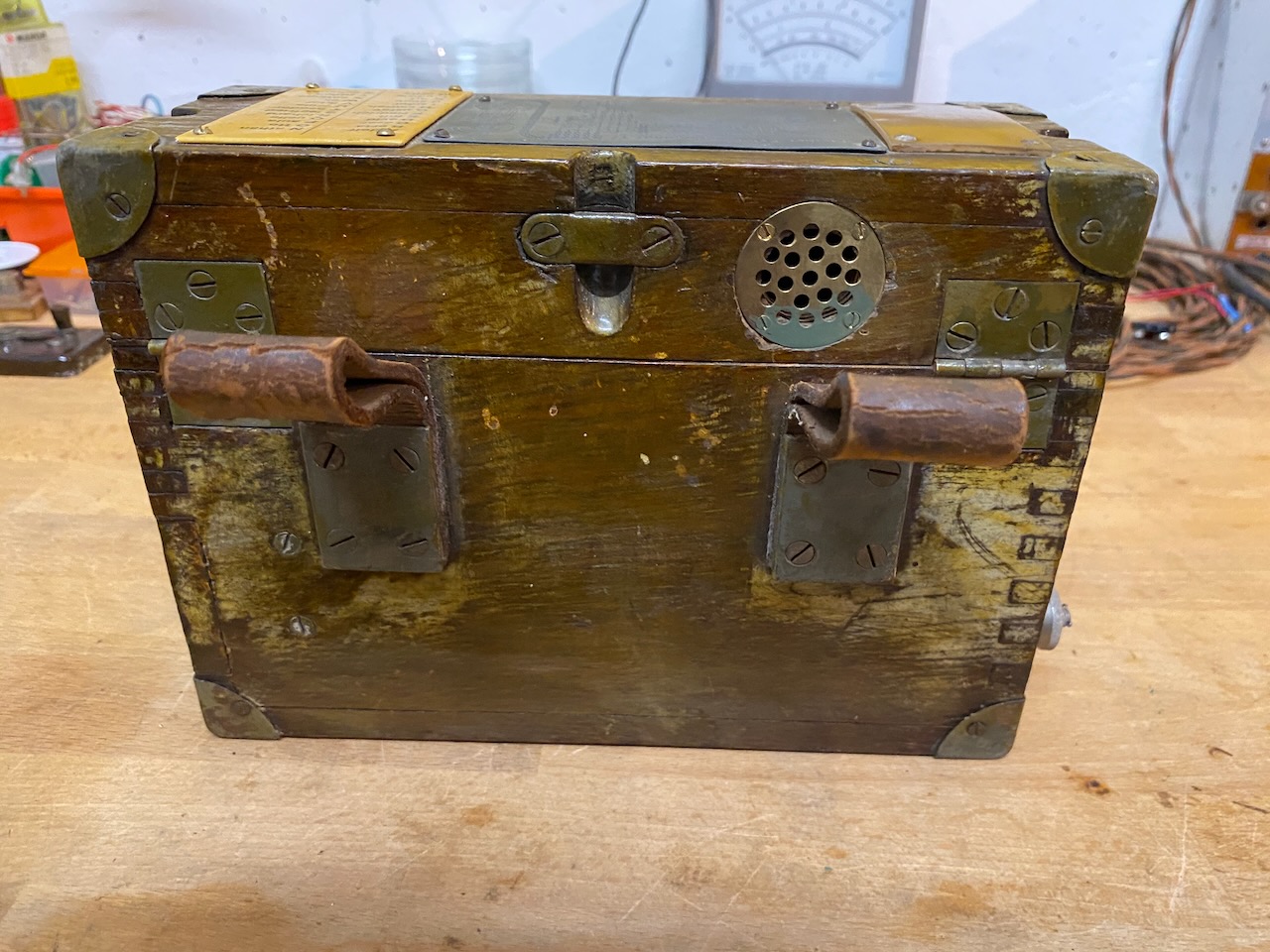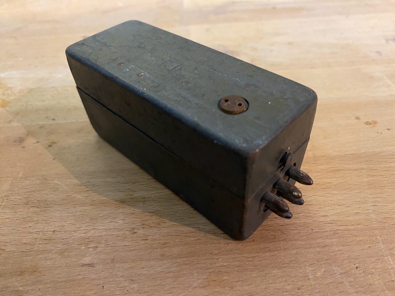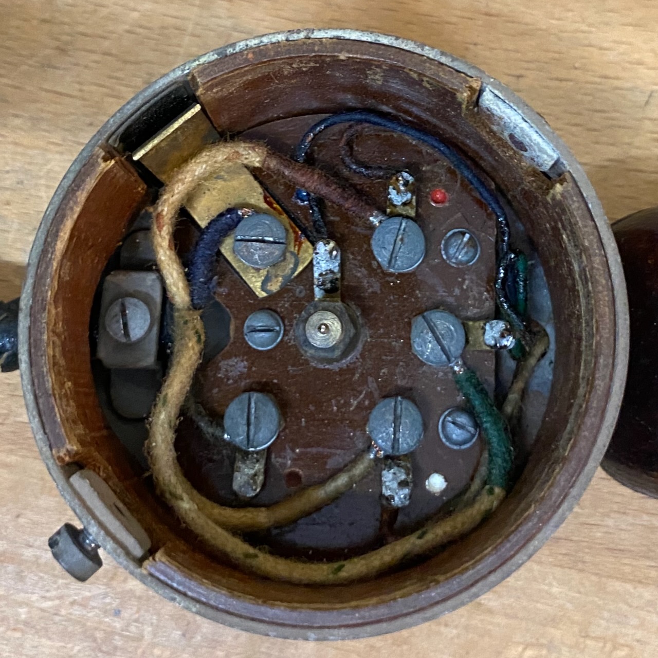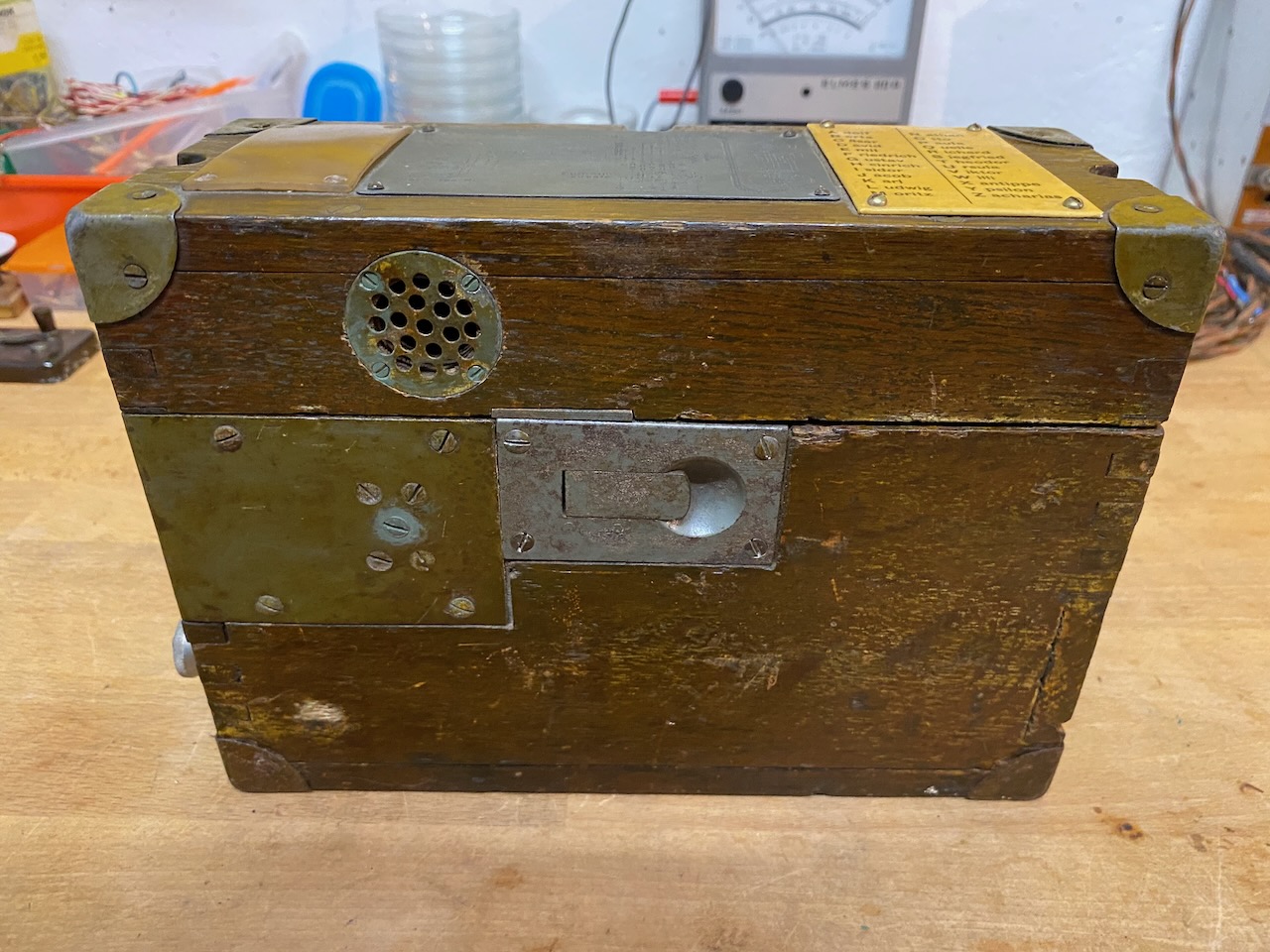 For the "kleiner Feldfernsprecher 17" there existed also a "Umgeänderter Zusatzkasten" or a "Weckerzusatz 17" to make it magneto call compatible [5][6]. The included "Vermittlungsschnur" (Switching cord) was carried in a pouch on the carrying strap (both missing on mine) [4].