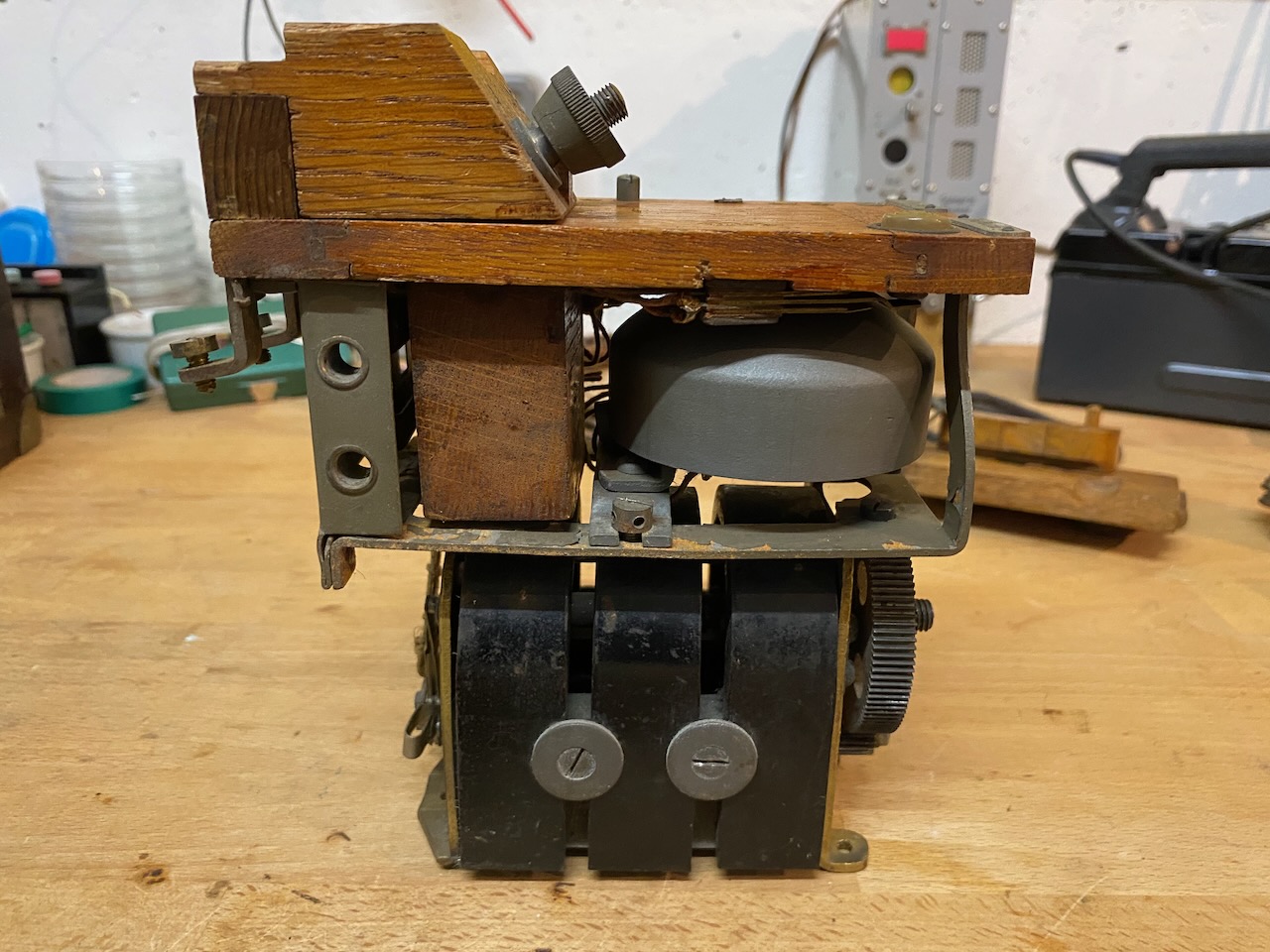 On the bottom the 3 bar magneto, above the ringer and to it's left the two connections sockets.