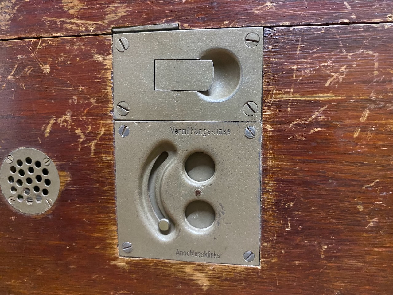 The sockets for the line plug for connection (Anschlussklinke) and switching (Vermittlungsklinke) are covered by a spring loaded moveable lid.