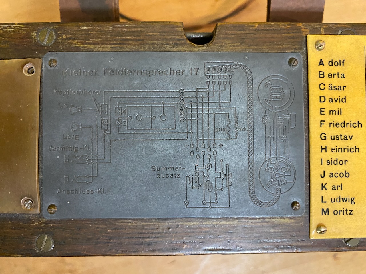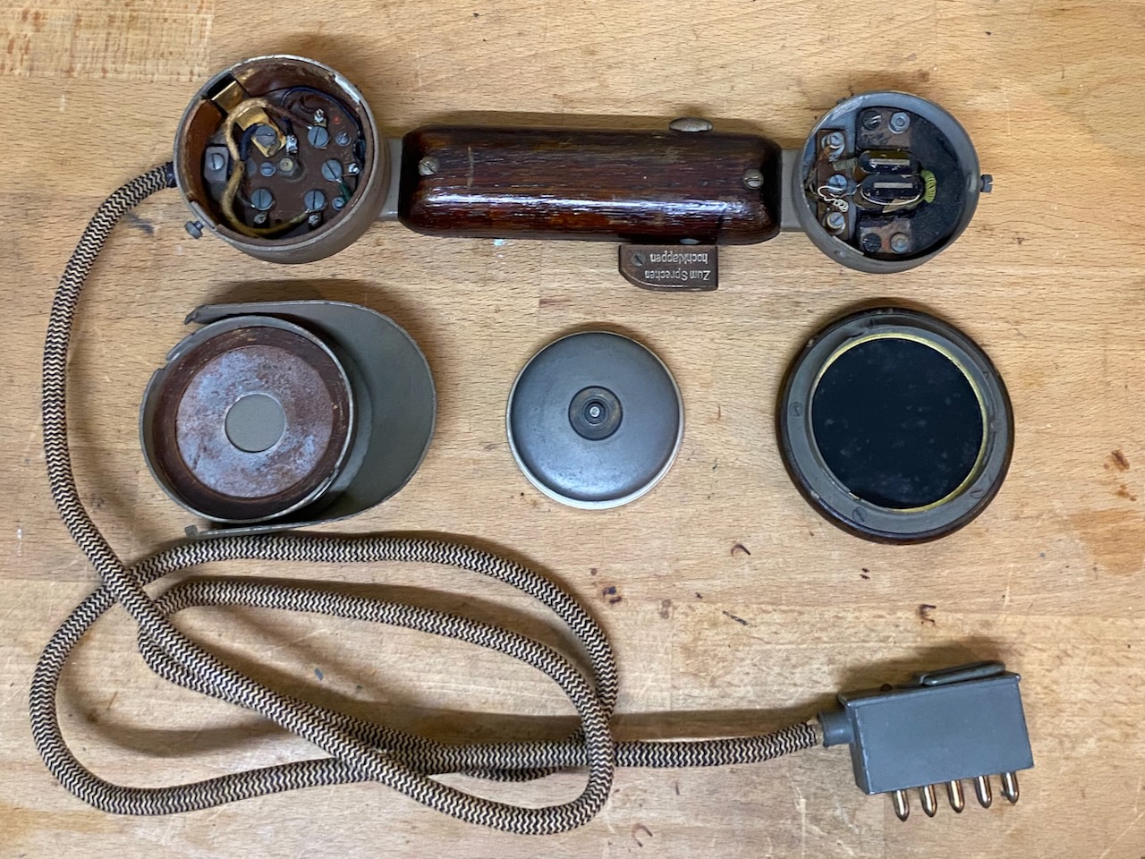 - The "Feldhandapparat 17" (Field Handset) consists of a wooden handle with an oval cross-section, which houses the springs for the push-to-talk button and the earpiece. The receiver and microphone are mounted similarly to the "Feldhandapparat 26", except that the microphone opening here consists of a hinged metal plate. The push-to-talk button — which, due to operating errors and user fatigue, was replaced by a hook switch on the "Feldfernsprecher 26" — is rotatable by 90 degrees so that when the handset is gripped correctly, the corresponding circuits inside are activated. The talk button must also be pressed to listen. For better hearing, the loudspeaker button must be pressed, which bridges the talk button and the secondary winding. The connecting cord to the handset has five conductors and terminates in a five-prong plug.