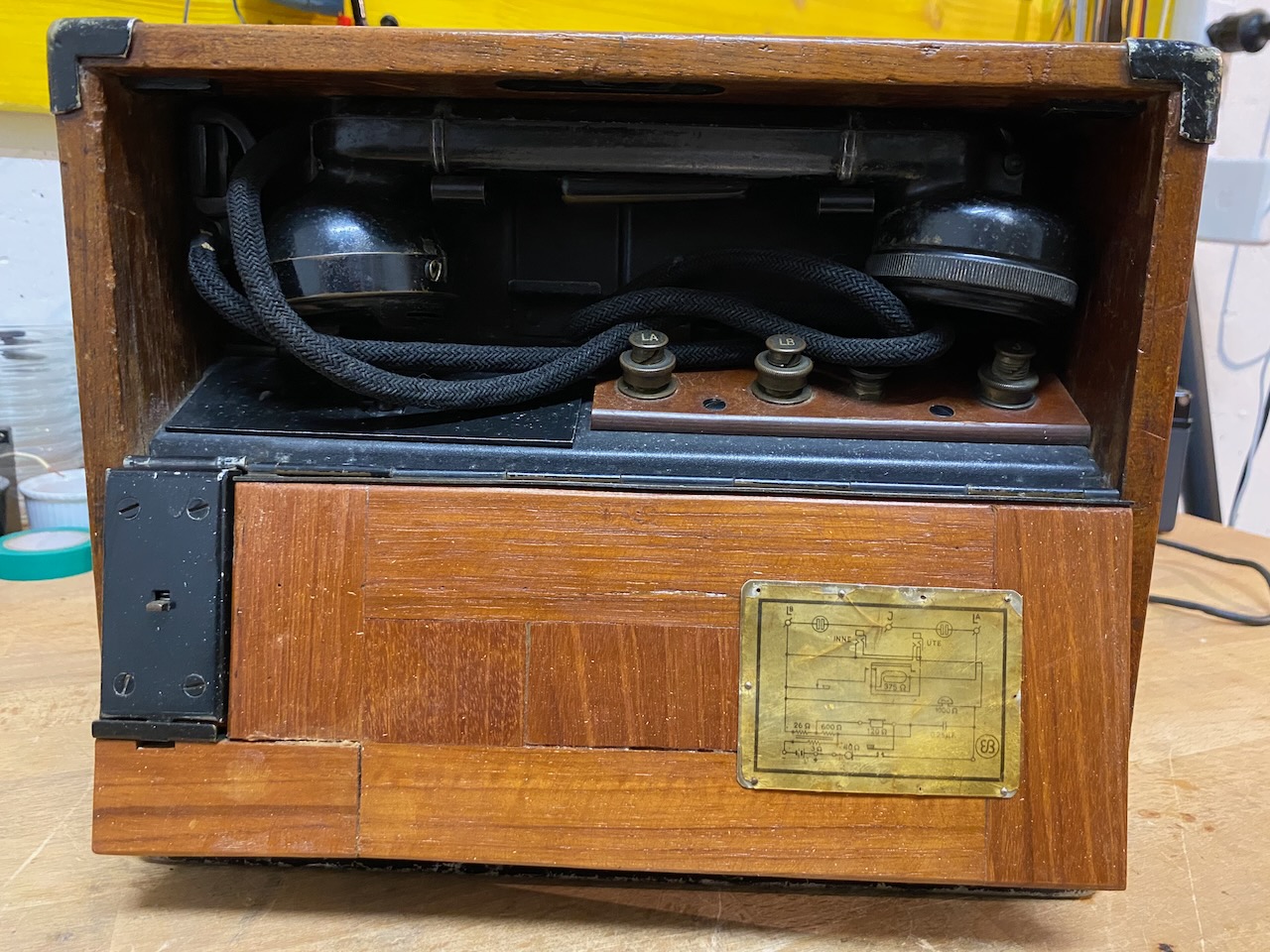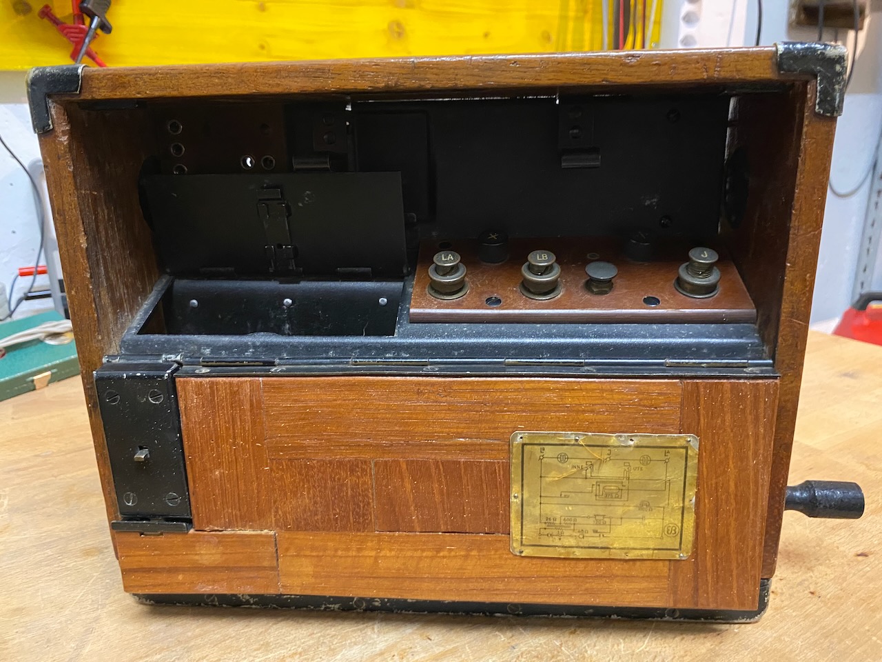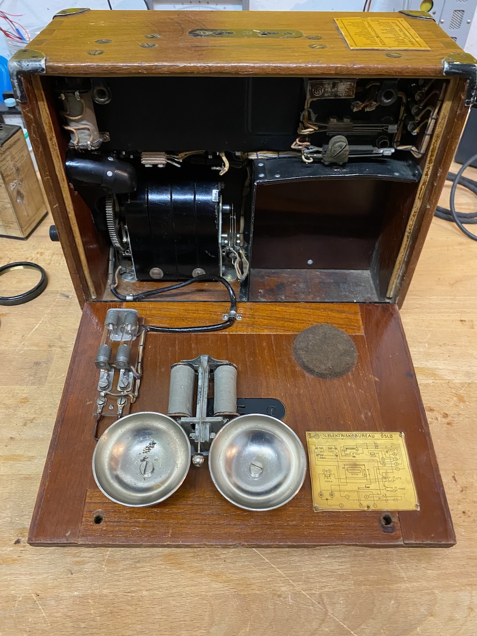This Elektrisk Buerau made device was commissioned by the Norwegian Army in 1930, acquired in 1931, and remained in use up to and during WWII. Elektrisk Bureau had already developed and sold a very similar device to the Turkish Army in 1929, and that earlier model served as the basis for the Norwegian version. In 1932, a dial unit and an amplifier attachment were added. In 1934, minor updates were made to the electrical system: the simple primary/secondary coil was replaced with an anti-sidetone coil setup. The earlier units were then designated as the “A model", while the updated versions became the “B model". An oval plate was mounted on top of the sets, marked with either A or B accordingly [1][2][5][6][11][12].