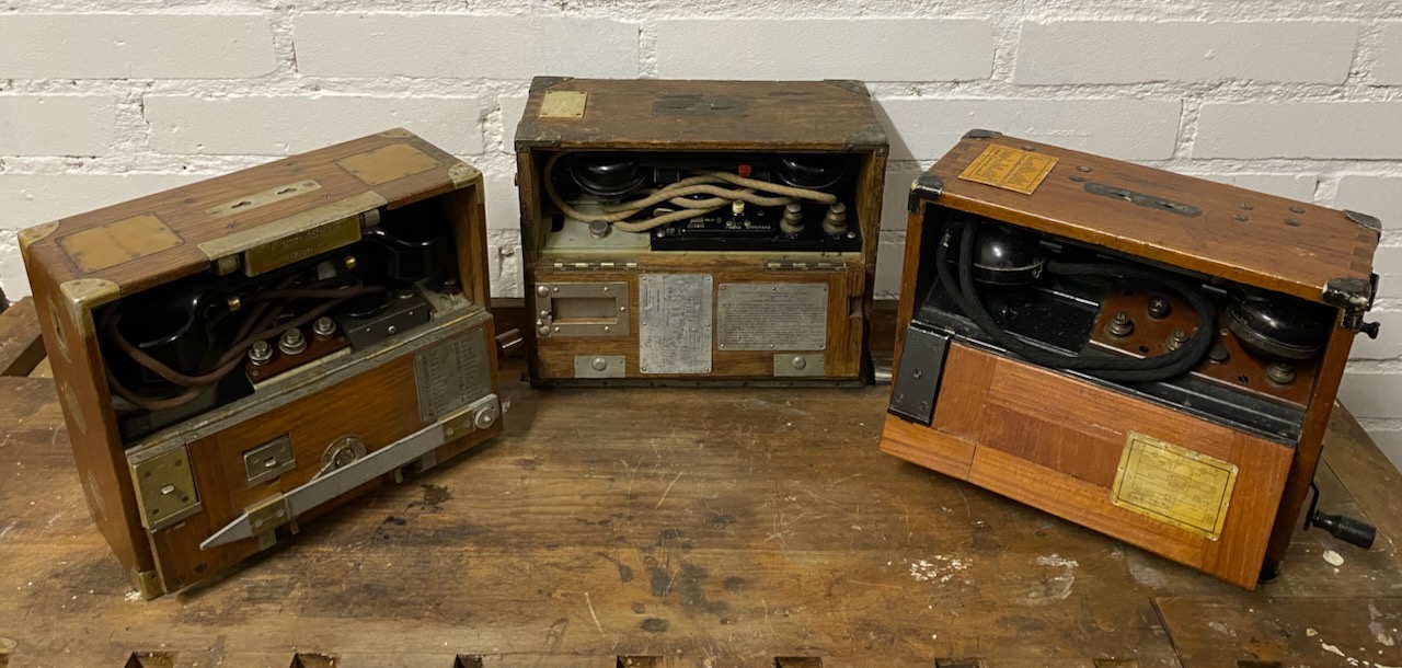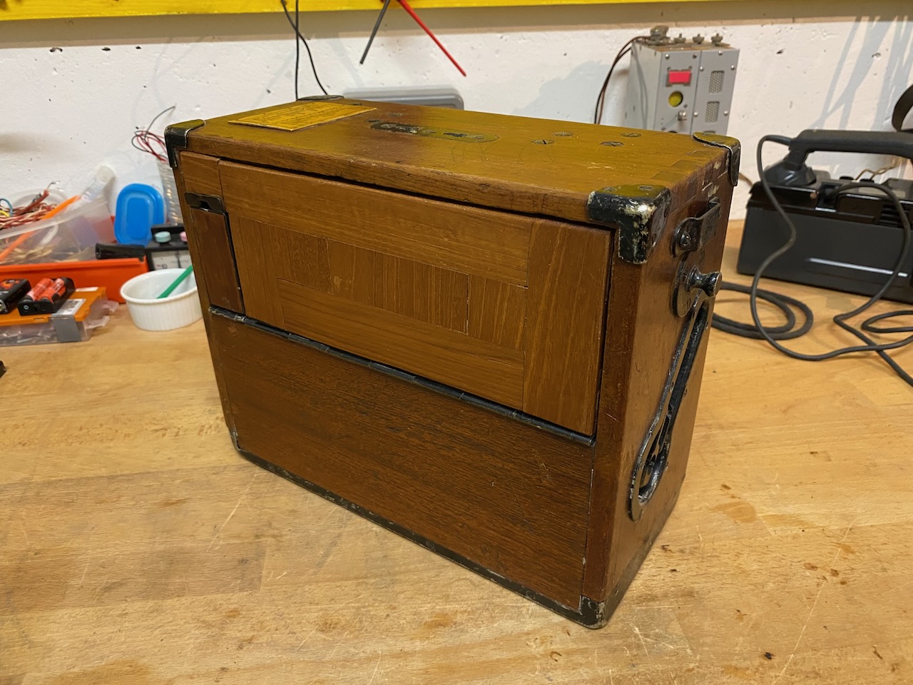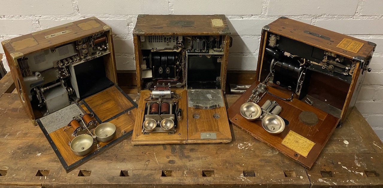 This Elektrisk Buerau made device was commissioned by the Norwegian Army in 1930, acquired in 1931, and remained in use up to and during WWII. Elektrisk Bureau had already developed and sold a very similar device to the Turkish Army in 1929, and that earlier model served as the basis for the Norwegian version. In 1932, a dial unit and an amplifier attachment were added. In 1934, minor updates were made to the electrical system: the simple primary/secondary coil was replaced with an anti-sidetone coil setup. The earlier units were then designated as the “A model", while the updated versions became the “B model". An oval plate was mounted on top of the sets, marked with either A or B accordingly [1][2][5][6][11][12].