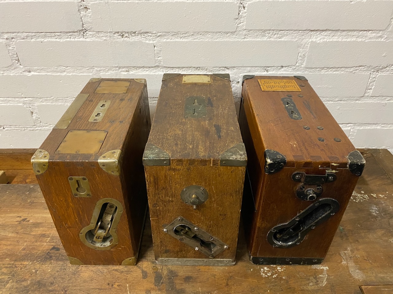 This specimen is a later “B” version, produced after 1934. It was seized by the Germans during the occupation of Norway, as indicated by the German spelling table attached to it. Most of the “B model” devices found on DigitaltMuseum also appear with German spelling tables and sometimes German user guides attached.