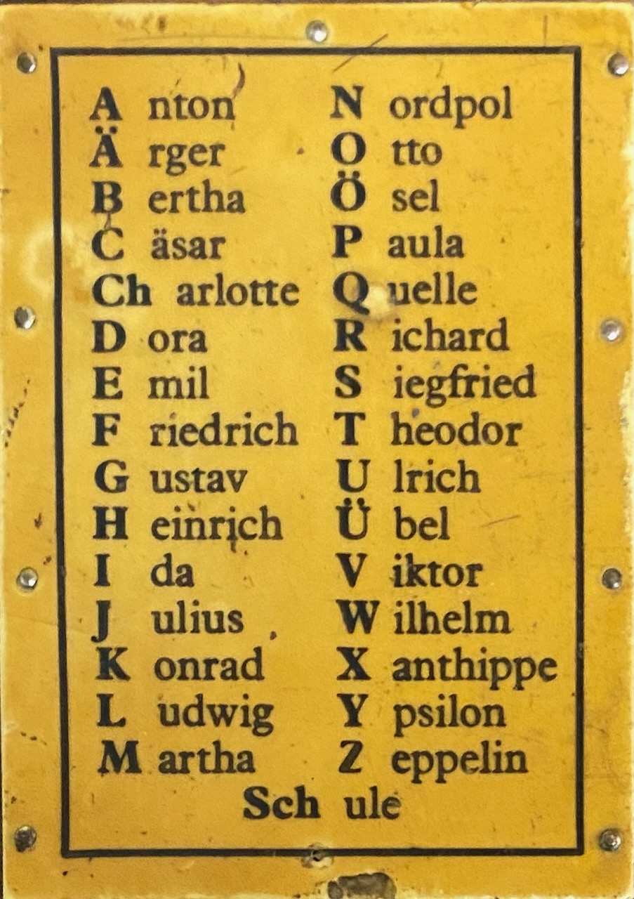 It corresponds to the german spelling alphabet version of post 1939 apart from "Ösel" (which is typically "Ödipus" on german spelling tables of that era).