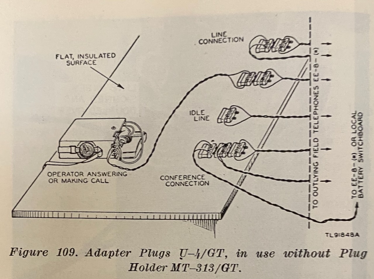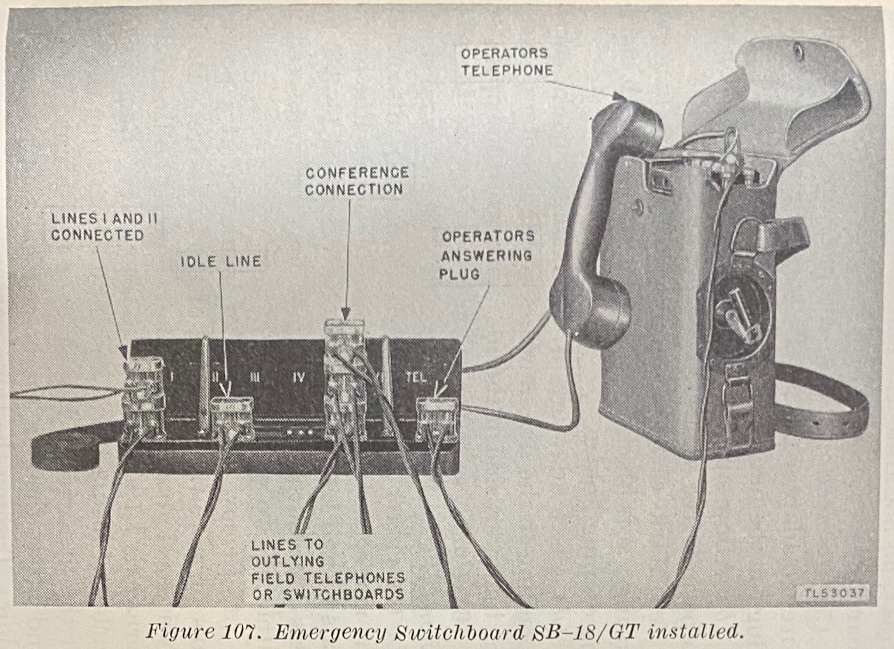 Emergency Switchboard SB-18/GT is a very light, highly mobile, emergency switching center for local battery telephone lines. With Telephone EE-8-( ) or Telephone TP-3 (sound-powered telephone) for an operator’s set, Emergency Switchboard SB-18/GT may serve as an emergency field replacement for a magneto switchboard. The Small size, weight, and moisture proof characteristics of the SB-18/GT suggest its use in jungle, mountain, amphibious, and air-borne operations. Adaptor Plug U-4/GT also may be used to substitute a silent visual signal for the audible magneto line signal provided in the ringer in either telephone. Telephone EE-8-( ) can operate the signal in Adapter Plug U-4/GT over distances up to 20 miles on Wire W-110-B.Adapter Plug U-4/GT [5]: